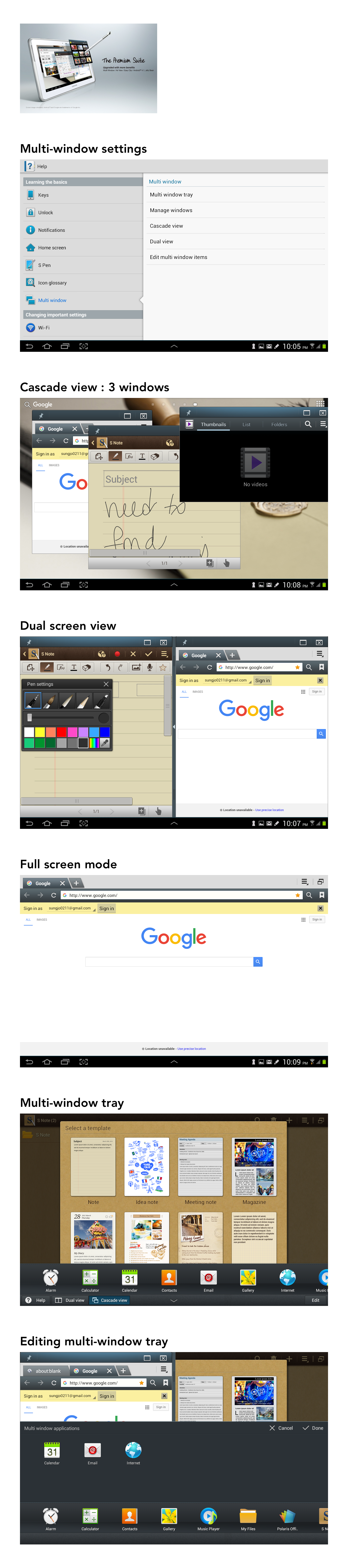 For Galaxy Note 10.1, multi-window UI was proposed to best leverage large screen along with stylus. I oversaw design team working on multi-window UI from design concepting to launch of this feature to market.